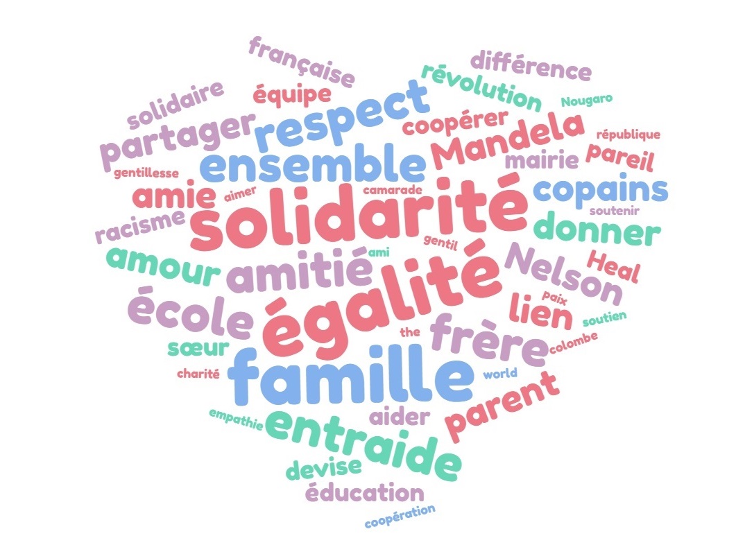 La rentrée de septembre 2025 s'est faite sous le signe de la Fraternité. Voici le nuage de mots que cette valeur a évoquée pour les classes à l'issue de cette première journée au Collège.