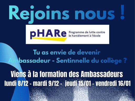 Par admin salinis, publié le jeudi 27 novembre 2025 20:24 - Mis à jour le jeudi 27 novembre 2025 22:25Formation les 8 et 9 décembre pour devenir des des Ambassadeurs-Sentinelles du Collège ! Inscription à la Vie scolaire avant le 3 décembre 2025. -