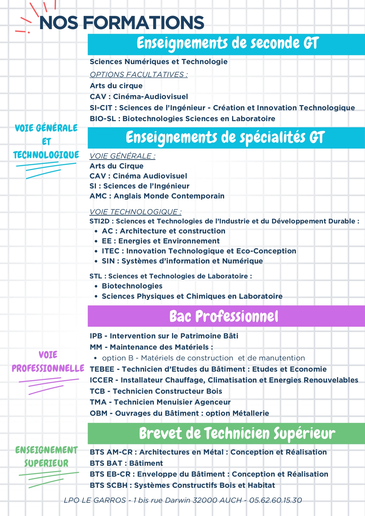 Pour tout renseignement et toute inscription à ces mini-stages, merci d’envoyer un courriel à l’adresse suivante : : ministages.le-garros@ac-toulouse.fr dans lequel vous précisez l’identité de l’élève, sa classe et son établissement d’origine ainsi que la section dans laquelle il souhaite effectuer son mini-stage (voir page suivante le descriptif des différentes sections).